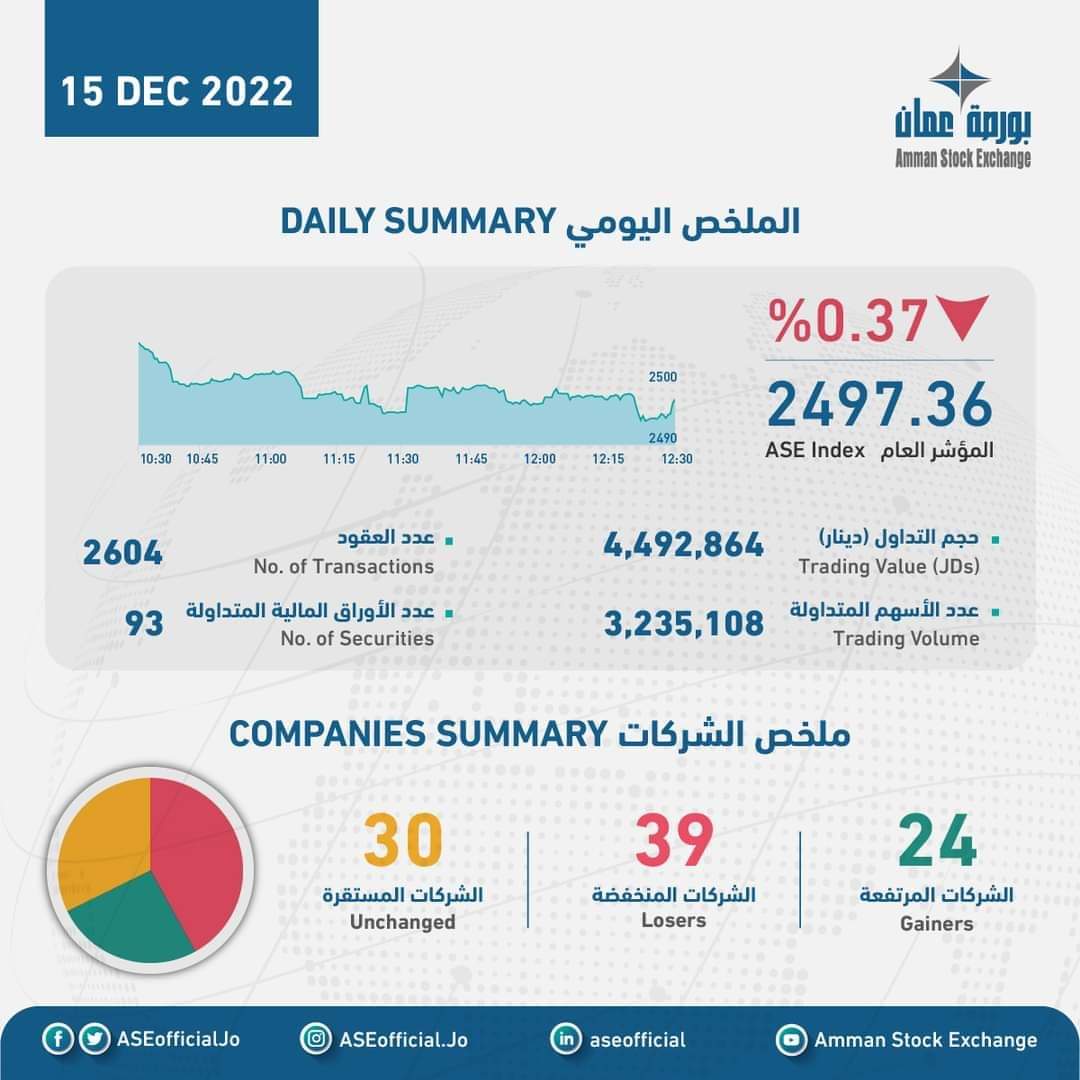 نبأ الأردن- بلغ حجم التداول الإجمالي ليوم الخميس 15/12/2022 حوالي (4.5) مليون دينار وعدد الأسهم المتداولة (3.2) مليون سهم، نفذت من خلال (2,604) عقداً.وعن مستويات الأسعار، فقد انخفض الرقم القياسي العام لأسعار الأسهم لإغلاق هذا اليوم إلى (2497.36) نقطة، بانخفاض نسبته (0.37%).وبمقارنة أسعار الإغلاق للشركات المتداولة لهذا اليوم والبالغ عددها (93) شركة مع إغلاقاتها السابقة، فقد أظهرت (24) شركة ارتفاعاً في أسعار أسهمها، و (39) شركة أظهرت انخفاضاً في أسعار أسهمها.أما على مستوى القطاعي، فقد انخفض الرقم القياسي قطاع الصناعة بنسبة 0.62%, و انخفض الرقم القياسي قطاع الخدمات بنسبة 0.41%، و انخفض الرقم القياسي قطاع المالي بنسبة 0.26%.أما بالنسبة للقطاعات الفرعية ، فقد ارتفع الرقم القياسي لقطاع الصناعات الكهربائية, الفنادق و السياحة, الخدمات المالية المتنوعة, الخدمات التعليمية, التأمين, الأدوية و الصناعات الطبية, الصناعات الهندسية و الانشائية 1.30%, 0.76%, 0.53%, 0.46%, 0.37%, 0.11%, 0.07% على التوالي. في حين انخفض الرقم القياسي لقطاع التبغ والسجائر, التكنولوجيا و الإتصالات, النقل, الصناعات الاستخراجية والتعدينية, الطاقة و المنافع, العقارات, الصناعات الكيماوية, البنوك, الأغذية و المشروبات, الخدمات التجارية 1.41%, 1.21%, 0.85%, 0.76%, 0.75%, 0.55%, 0.48%, 0.31%, 0.04%, 0.01% على التوالي.وبالنسبة للشركات الخمس الأكثر ارتفاعاً في أسعار أسهمها فهي اسمنت الشمالية بنسبة (7.27%), فيلادلفيا لصناعة الأدوية بنسبة (6.92%), الزرقاء للتعليم والاستثمار بنسبة (6.19%), الوطنية لصناعة الكوابل والأسلاك الكهربائية بنسبة (5.88%), و العربية الدولية للفنادق بنسبة (4.82%).أما الشركات الخمس الأكثر انخفاضاً في أسعار أسهمها فهي أمواج العقارية بنسبة (6.67%), فينيكس العربية القابضة بنسبة (5.56%), الفنادق والسياحة الاردنية بنسبة (4.98%), نور كابيتال ماركتس للإستثمارات المتعددة بنسبة (4.97%), و المتوسط والخليج للتأمين-الأردن بنسبة (4.44%).