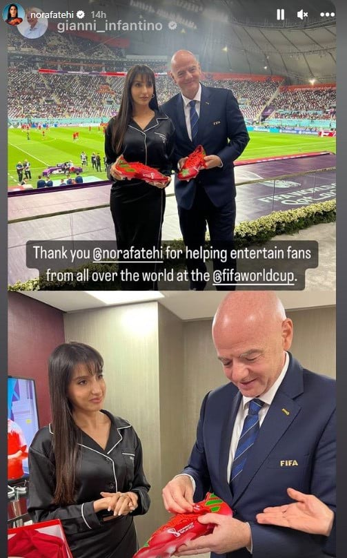 وأعادت نورا فتحي نشر الصور التي شاركها إنفانتينو، فيما شارك أمين الحناوي، مدير أعمالها صورا لنجمة بوليود الشهيرة وتقدم بالشكر لكل من رئيس ”فيفا“ ونورة فتحي، والمنتخب المغربي على تجربة كأس العالم في دورته الـ 22.