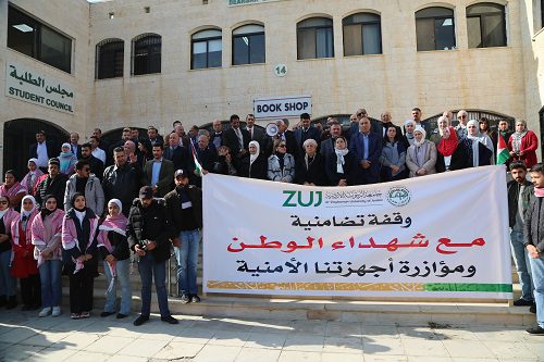 نبأ الأردن-نظمت عمادة شؤون الطلبة في جامعة الزيتونة الاردنية وقفة تضامنية مع الاجهزة الامنية والقوات المسلحة،عبَرت عن استنكارهم للاعتداءات المتكررة بحق رجال الامن العام الساهرين على امن الوطن والمواطن، بحضور رئيس الجامعة الاستاذ الادكتور محمد المجالي ونائب الرئيس الاستاذ الدكتور طارق القرم وعميد شؤون الطلبة الدكتور منير العفيشات والعمداء واعضاء الهيئتين التدريسية والاداريه والطلبة.
