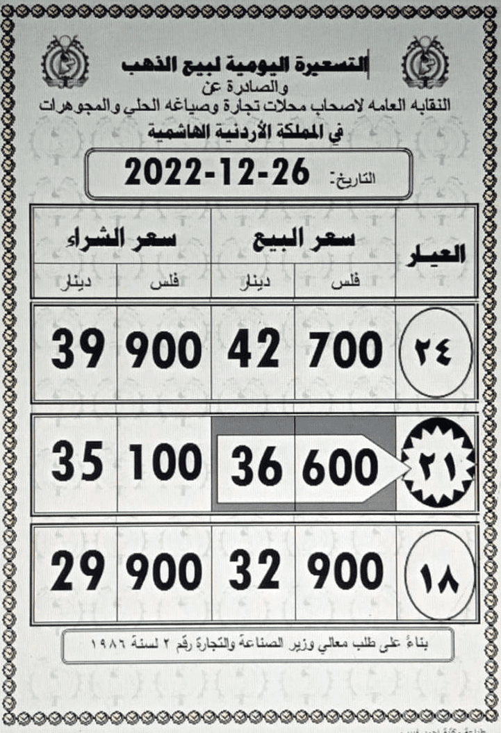 نبأ الأردن-استقرت أسعار الذهب في السوق المحلي الأردني ، الاثنين (26/12/2022)، بحسب التسعيرة الصادرة عن النقابة العامة لأصحاب محلات تجارة وصياغة الحلي والمجوهرات. وبلغ سعر غرام الذهب عيار 21 عند 36.60 دينار، لجهة شراء المواطنين من المحلات مقابل 35.10 دينار لجهة البيع من المواطنين للتجار. وبلغ سعر غرام الذهب عياري 24 و18 عند 42.70 و 32.90 دينار على التوالي.