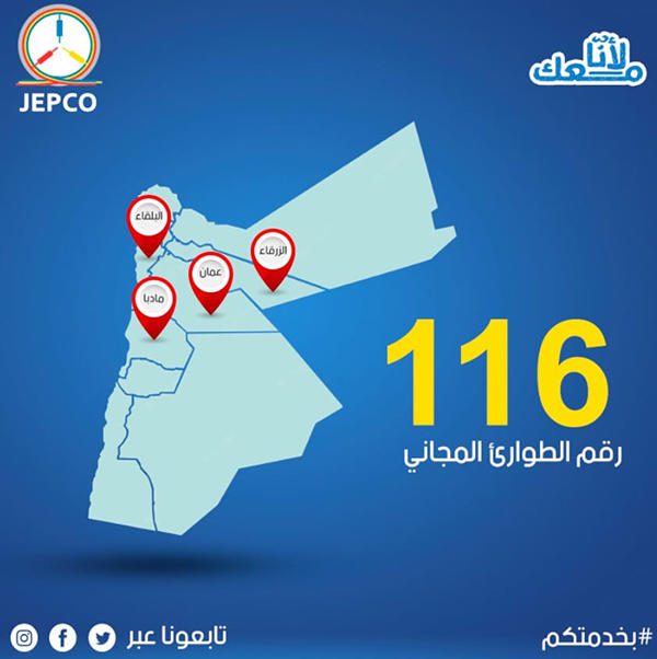ووجهت بضرورة الإبلاغ عن أي أعطال أو أسلاك ساقطة على الأرض وعدم الاقتراب منها والاتصال عبر رقم الطوارئ 116 للابلاغ عن اي ملاحظة او انقطاع كهربائي في :