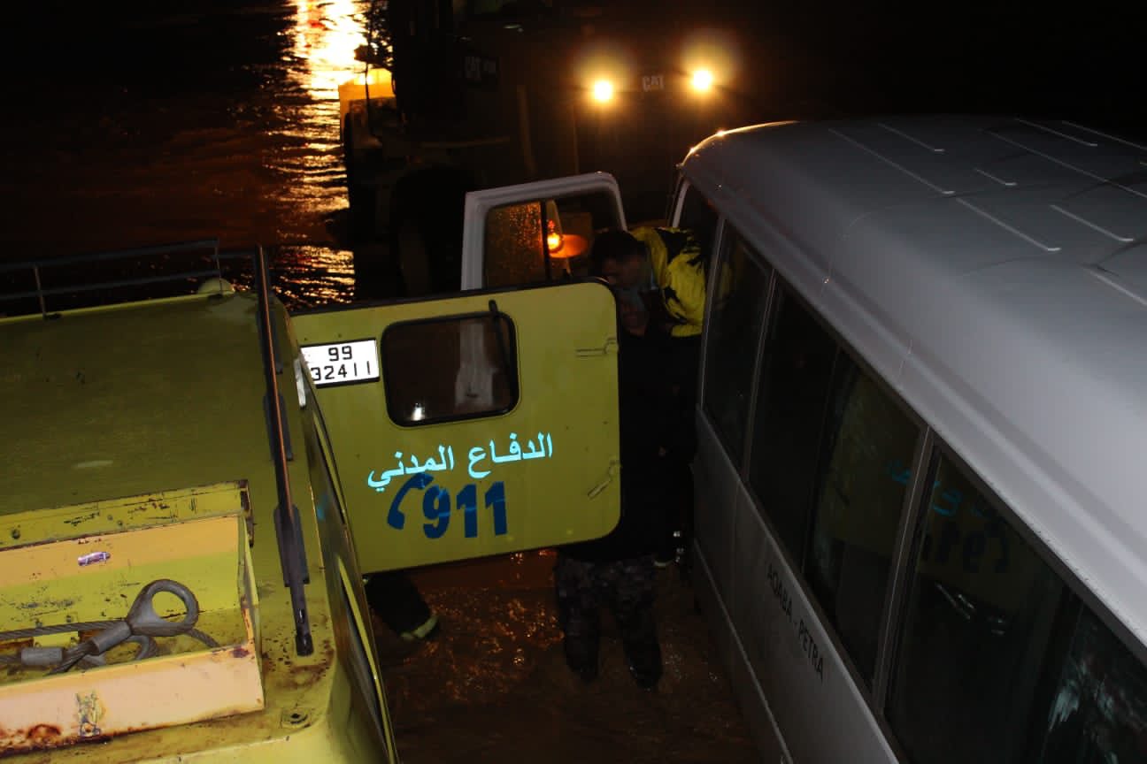 قال الناطق الإعلامي باسم مديرية الأمن العام إنّ فرق الدفاع المدني المتخصصة والعاملة في مديرية دفاع مدني معان تعاملت مع إنقاذ ركاب حافلة نقل متوسطة بعد محاصرتهم بمياه الأمطار داخل حافلتهم (نقل جماعي) في محافظة معان وذلك بسبب ارتفاع منسوب المياه وسرعة جريانه في الطريق العام .
