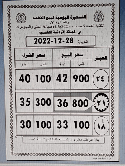 وبلغ سعر بيع غرام الذهب عيار 21 الأكثر رغبة من الأردنيين بالسوق المحلية عند 36,80 دينار لغايات شراء المواطنين من محلات الصاغة.
