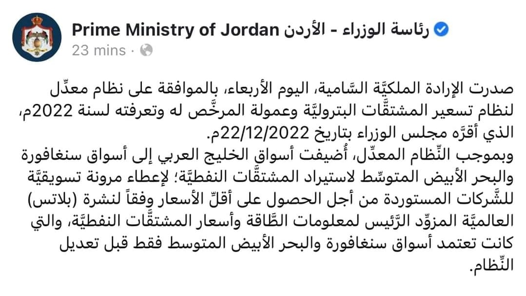 وقال الشوبكي ان الحكومة كانت تقوم بتسعير المشتقات النفطية محلياً حسب نشرة بلاتس على سعر بورصة سنغافورة بينما كانت الشركات تستورد من اسواق الخليج القريبة وبسعر اقل، وكان الفارق يذهب لصالح الشركات