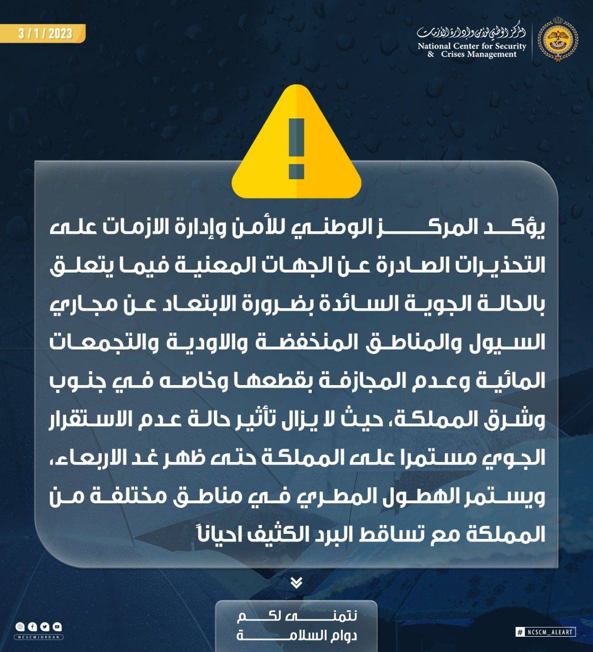 نبأ الأردن - يؤكد المركز الوطني للأمن وإدارة الازمات على التحذيرات الصادرة عن الجهات المعنية فيما يتعلق بالحالة الجوية السائدة بضرورة الابتعاد عن مجاري السيول والمناطق المنخفضة والاودية والتجمعات المائية وعدم المجازفة بقطعها وخاصه في جنوب وشرق المملكة، حيث لا يزال تأثير حالة عدم الاستقرار الجوي مستمرا على المملكة حتى ظهر غد الاربعاء، ويستمر الهطول المطري في مناطق مختلفة من المملكة مع تساقط البرد الكثيف احيانا.