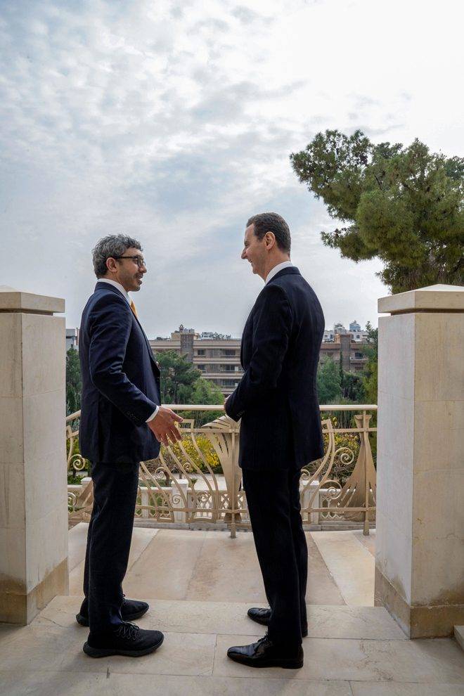 ونقل وزير الخارجية والتعاون الدولي الإماراتي للرئيس الأسد تحيات الشيخ محمد بن زايد آل نهيان رئيس دولة الإمارات، والشيخ محمد بن راشد آل مكتوم نائب رئيس الدولة، وأكّد أنّ الإمارات حريصة على تعزيز التعاون بين البلدين وتوسيع آفاقه، واستمرار التشاور والتنسيق مع سوريا حول مختلف القضايا.