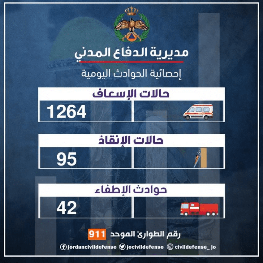 نبأ الأردن-تعاملت مديرية الدفاع المدني خلال الــ 24 ساعة الماضية مع (1264) حالة إسعافية مختلفة، حيث تم إجراء اللازم لهم وتأمين وصولهم إلى المستشفيات.