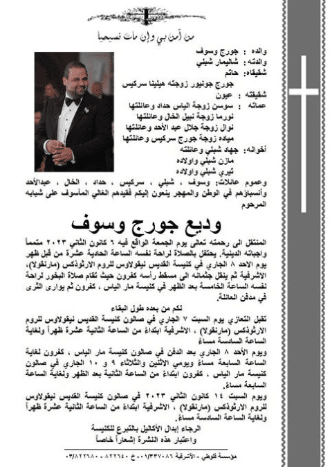 وأضاف الحساب: ”ثم ينقل جثمانه إلى مسقط رأسه مفروم، حيث تقام صلاة البخور لراحة نفسه الساعة الخامسة بعد الظهر في كنيسة متر الياس؛ كفرون ثم يوارى الثرى في مدافن العائلة“.