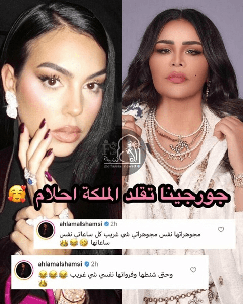 أحلام تركت تعليق تحت صورة جورجينا إتهمت فيه الأخيرة بطريقة غير مباشرة بتقليدها فكتبت: ” مجوهراتها نفس مجوهراتي شي غريب، وساعاتها نفس ساعاتي”.