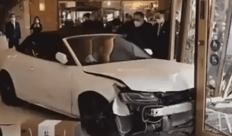 وانتشرت في مواقع التواصل مقاطع فيديو تظهر سيارة بيضاء يحاول سائقها تحطيم مدخل فندق "سنترال هوتيل" في شنغهاي قبل أن يدخل البهو.