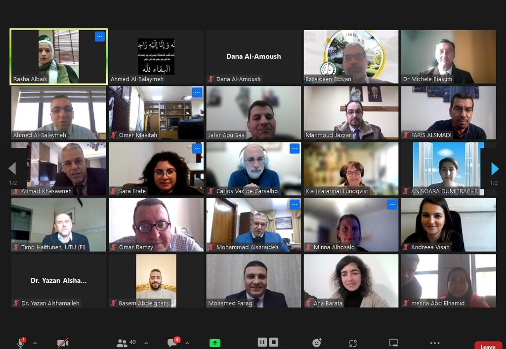 وفي بداية اللقاء، افتتح منسق المشروع في الجامعة الأردنية الدكتور أحمد السلايمة الاجتماع مرحبا بالمشاركين من الجامعات الأردنية والمصرية والفلسطينية والأوروبية، وقام المشاركون بتقديم أنفسهم والمؤسسات التعليمية التي ينتمون إليها، وذلك بحضور 55 شخصًا من الجامعات الشريكة في الأردن ومصر وفلسطين وفنلندا ورومانيا وإيطاليا والبرتغال للاجتماع.