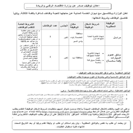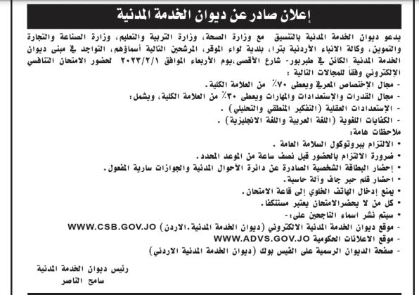 نبأ الأردن-أعلنت عدد من الوزارات و المؤسسات الحكومية، اليوم الثلاثاء، عدد من الوظائف الشاغرة لديها، بالتنسيق مع ديوان الخدمة المدنية.