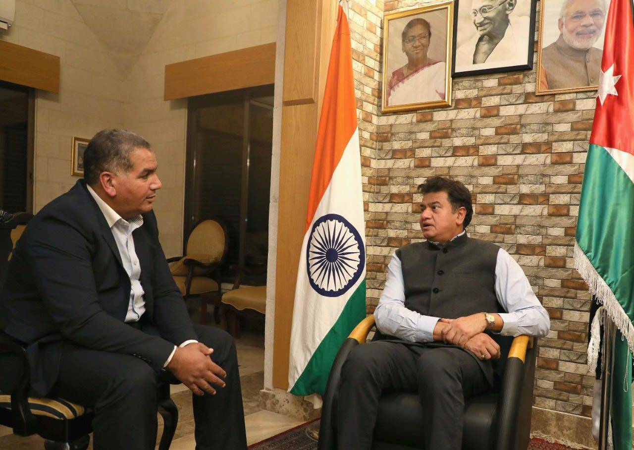 وقال، ان الهند والأردن يرتبطان بعلاقات وثيقة وودية طويلة الأمد ويلتزمان بالتعددية، ويتشاركان الكثير من الاهتمامات في المحافل الدولية، ويسعيان جاهدين من أجل السلام والاستقرار العالميين، مشيرا الى أن علاقات البلدين تغطي مجموعة واسعة من المجالات تشمل التعاون السياسي، التجارة الاستثمار، التكنولوجيا، الثقافة، الصحة، السلع الزراعية، المنسوجات، الكيماويات والأسمدة، وشراكة التنمية.