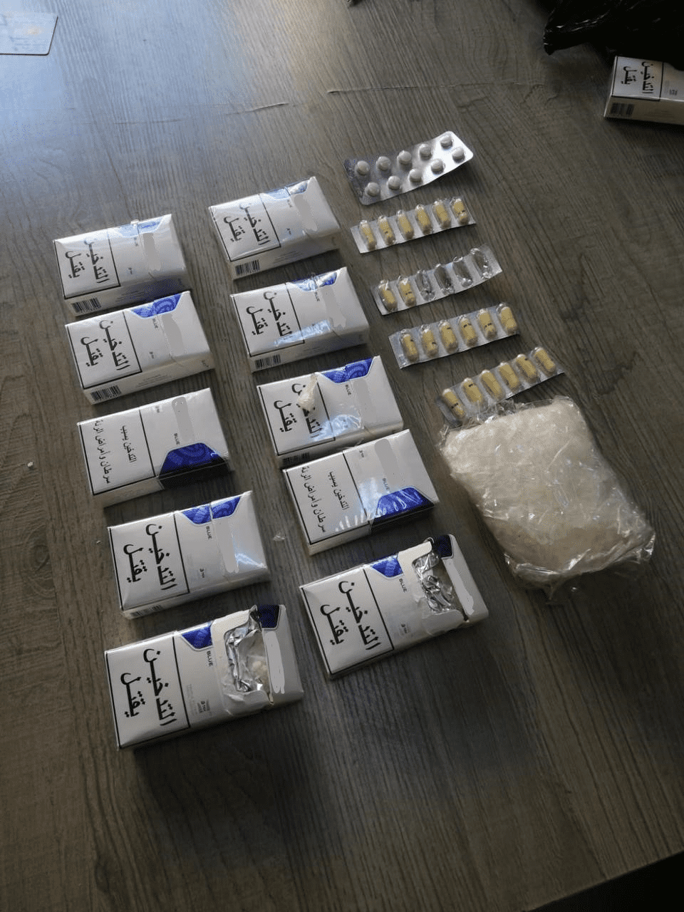 فيما وقع الاشتباه باحد الاشخاص في القضية الثانية اثناء قدومه عبر ذات المعبر الحدودي إذ جرى تفتيشه وضبط بحوزته كميات من مادة الكريستال القاتلة وكمية من الحبوب المخدرة اخفيت داخل علب التبغ .