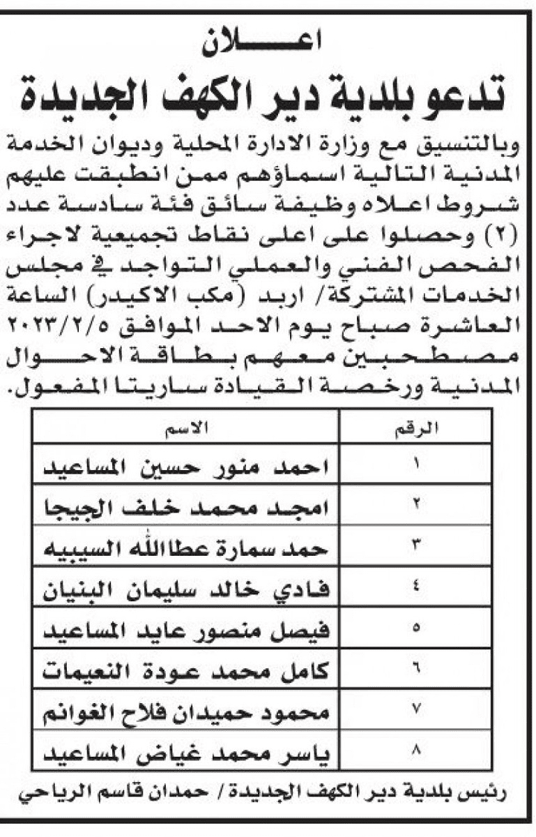 كما دعا ديوان الخدمة المدنية بالتنسيق مع عدد من الوزارات والمؤسسات الحكومية الأشخاص التالية لإجراء المقابلات الشخصية والفحص الفني.