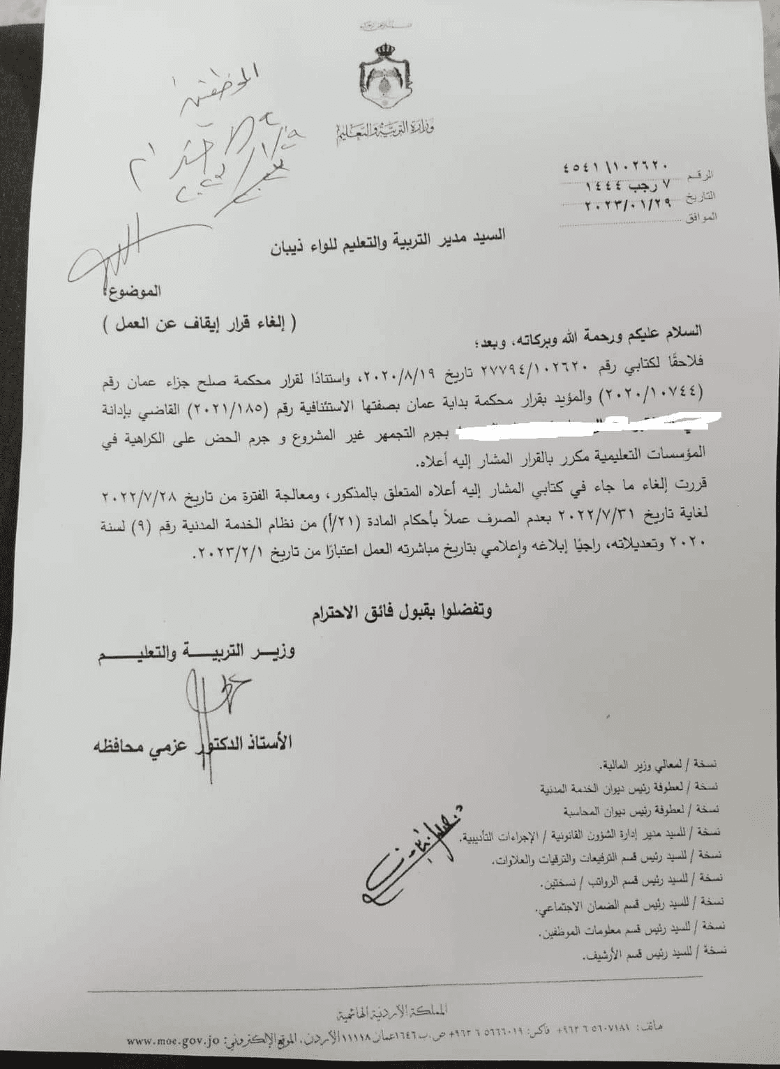وجاء قرار الوزير استنادا لقرار محكمة صلح جزاء عمان والمؤيد بقرار محكمة بداية عمان بصفتها الاستئنافية.