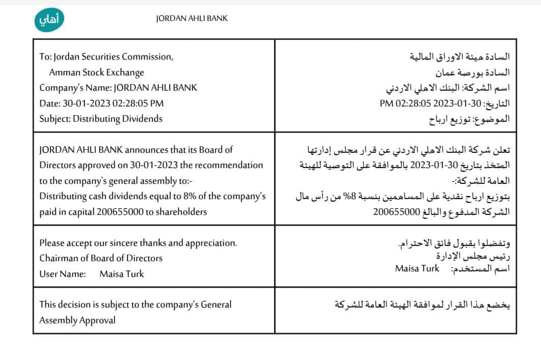 نبأ الأردن - في افصاح له على موقع بورصة عمان , أعلن البنك الأهلي موافقة مجلس الإدارة على توصية الهيئة العامة بتوزيع أرباح بنسبة 8% على المساهمين.