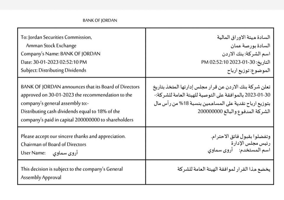 نبأ الأردن - في افصاح له على موقع بورصة عمان , أعلن بنك الأردن موافقة مجلس الإدارةدارة على توصية الهيئة العامة بتوزيع أرباح بنسبة 18% على المساهمين.