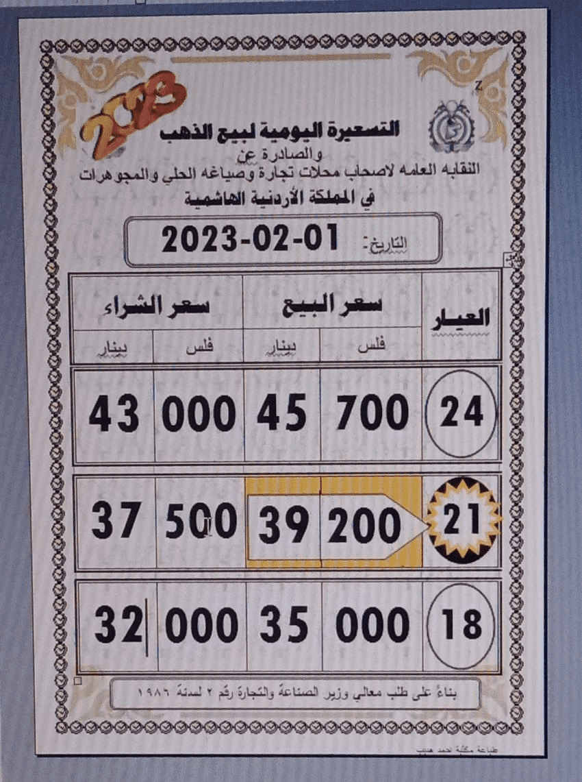 نبأ الأردن-ارتفعت أسعار الذهب في السوق المحلي الأردني ، اليوم الأربعاء، 30 قرشا، بحسب النقابة العامة لأصحاب محلات بيع وصياغة الحلي والمجوهرات.