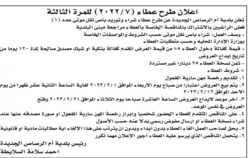 نبأ الأردن- طرحت بلدية ام الرصاص عطاء لشراء باص نقل موتى ، وفقا لما هو مرفق في الإعلان التالي :