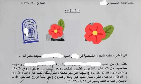 وبحسب وثيقة عقد الزواج، فإن العقد تم بين رجل من مواليد 1930 ميلادية، وامرأة من مواليد 1931 ميلادية، وكلاهما أرمل.