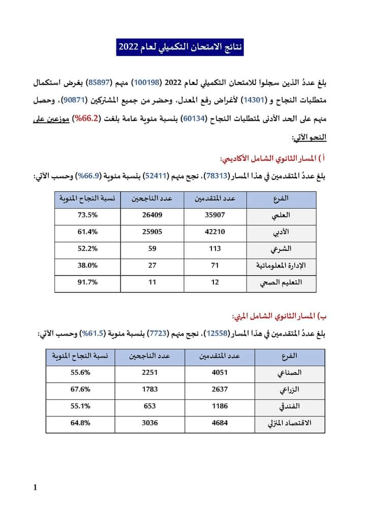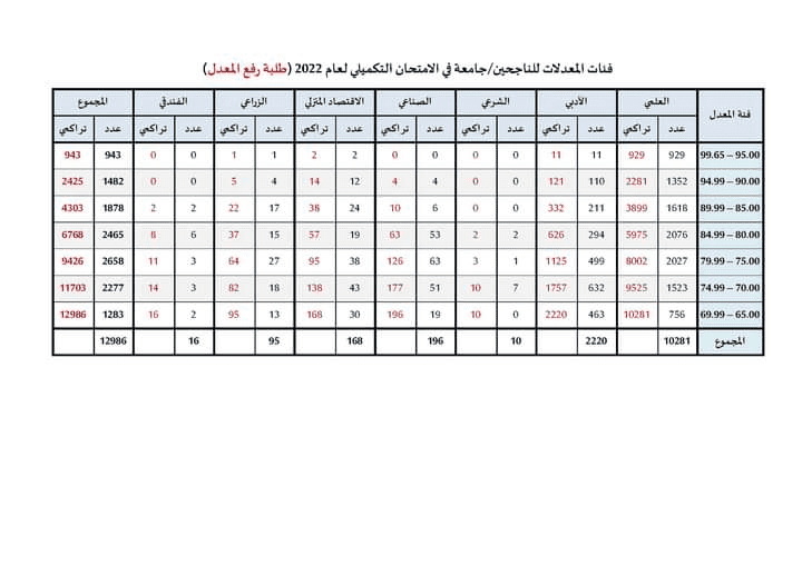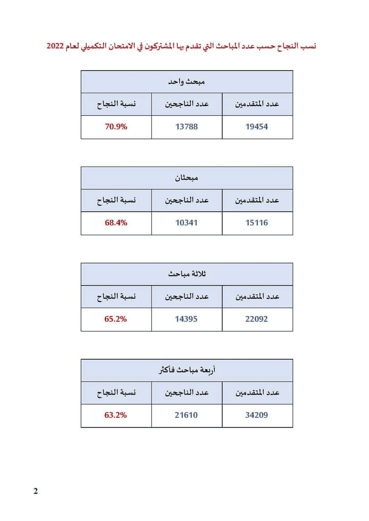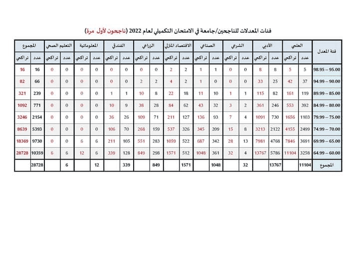 وبينت الوزارة في بيان صحفي اليوم الخميس، أن نسب النجاح العامة، ونسب النجاح في المباحث، وتداريج المعدلات كما هو مبين تاليا: