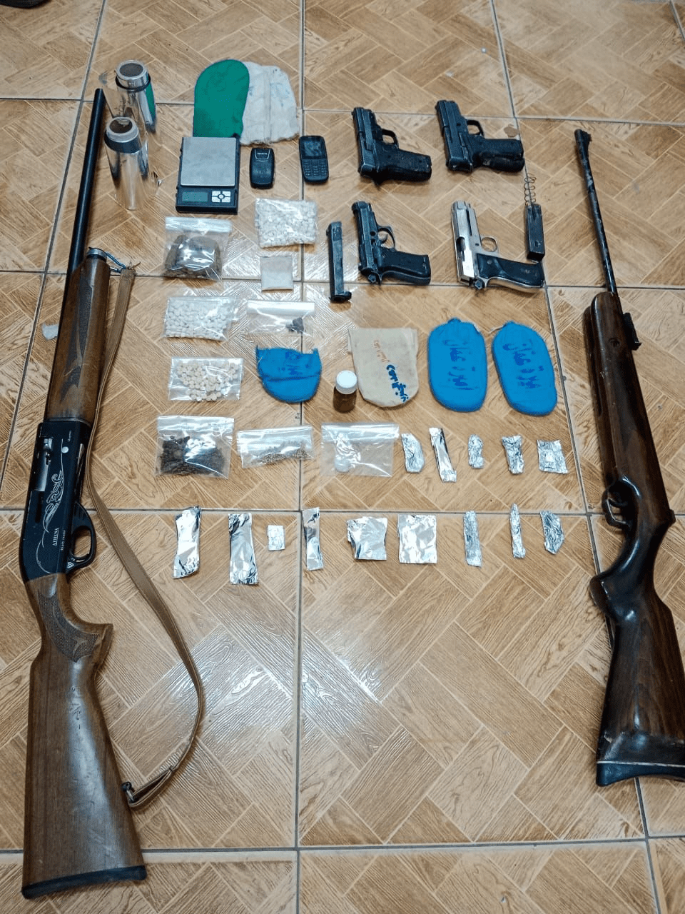 ** ضبط كميات كبيرة ومتفرقة من المخدرات وأسلحة نارية .