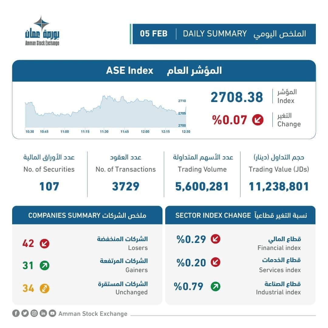 نبأ الأردن - بلغ حجم التداول الإجمالي ليوم الأحد 05/02/2023 حوالي (11.2) مليون دينار وعدد الأسهم المتداولة (5.6) مليون سهم، نفذت من خلال (3,728) عقداً.