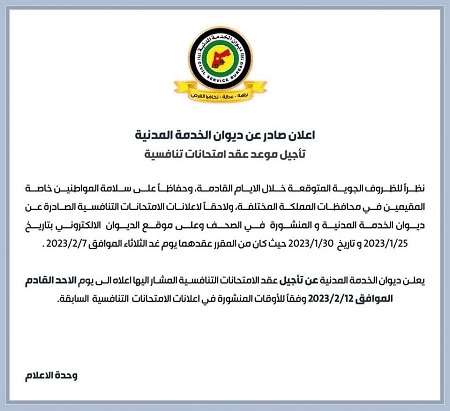 نبأ الأردن - قرر ديوان الخدمة المدنية اليوم الإثنين، تأجيل عقد الامتحانات التنافسية نظرا للظروف الجوية.