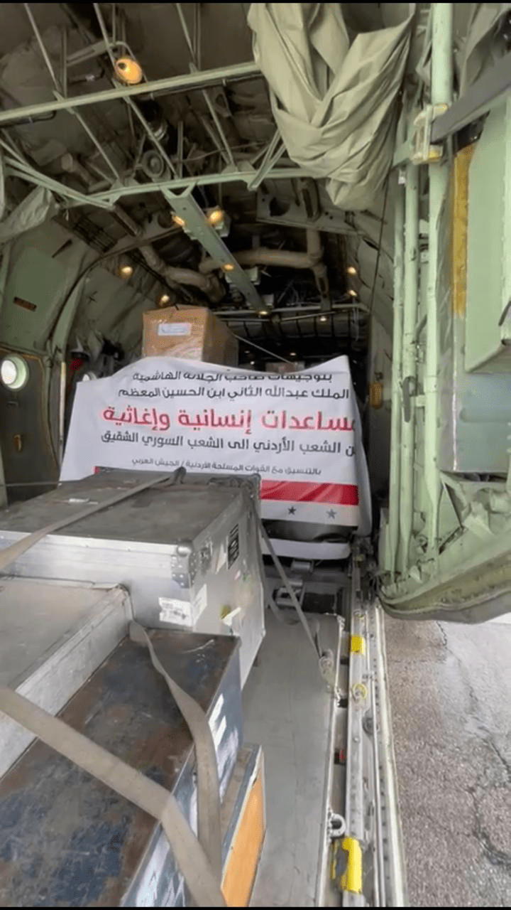 وبذلك يكون الأردن قد سير خلال اليوم وأمس خمس طائرات إغاثية إلى سوريا وتركيا محملة بمعدات إنقاذ وخيام ومواد لوجستية وطبية ومساعدات إغاثية وغذائية ومنقذين أردنيين من فريق البحث والإنقاذ الدولي، وأطباء من الخدمات الطبية الملكية.