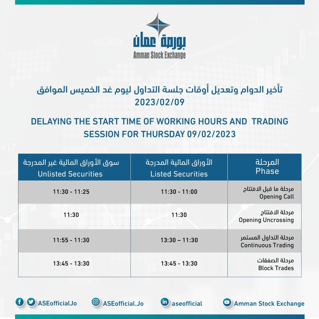نبأ الأردن - في ضوء قرار دولة رئيس الوزراء تأخير موعد دوام الدوائر الحكومية والمؤسسات الرسمية ليوم غد الخميس الموافق 2023/02/09 حتى الساعة العاشرة صباحاً نظراً للأحوال الجوية السائدة، تعلن بورصة عمان تأخير موعد دوامها الرسمي ليوم غد الخميس الموافق 2023/02/09 حتى الساعة العاشرة صباحاً.