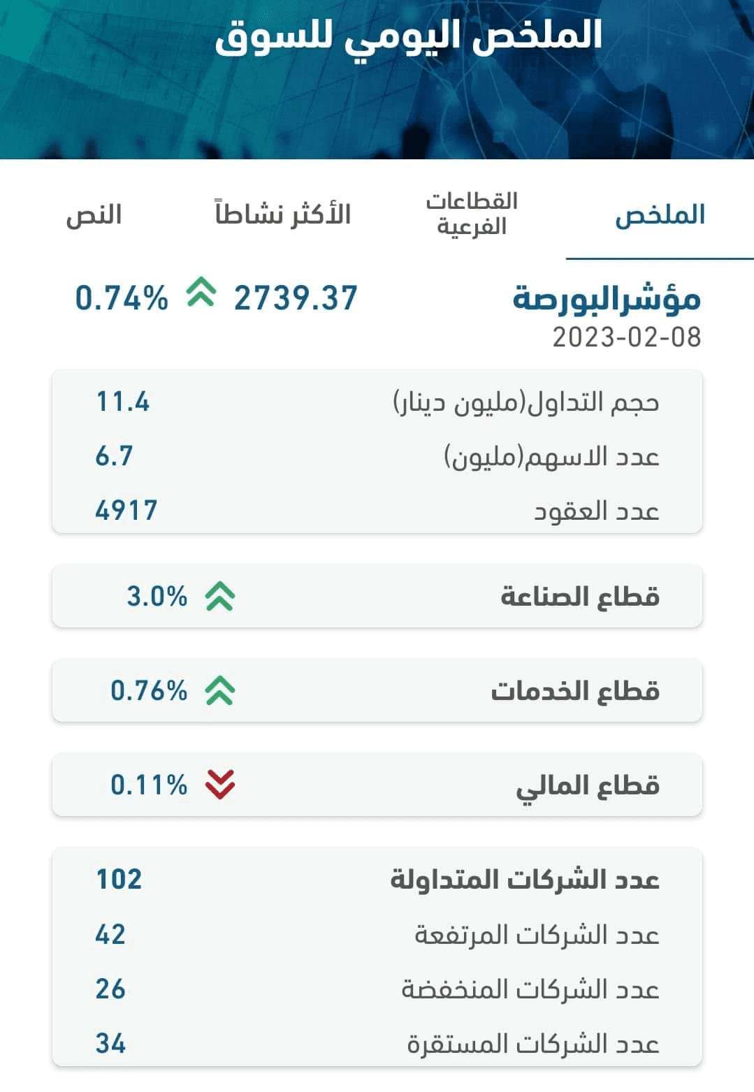 نبأ الأردن - بلغ حجم التداول الإجمالي ليوم الأربعاء 08/02/2023 حوالي (11.4) مليون دينار وعدد الأسهم المتداولة (6.7) مليون سهم، نفذت من خلال (4,917) عقداً.