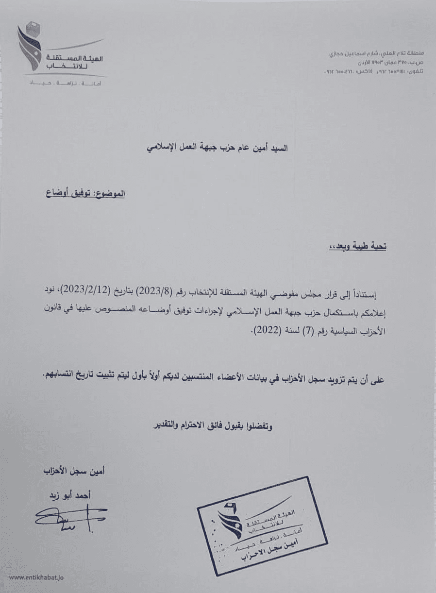 نبأ الأردن - أعلنت الهيئة المستقلة للانتخاب عن استكمال حزب جبهة العمل الإسلامي لإجراءات توفيق الأوضاع وفقا لقانون الأحزاب السياسية الجديد بحسب كتاب صادر من الهيئة إلى أمين عام الحزب المهندس مراد العضايلة.