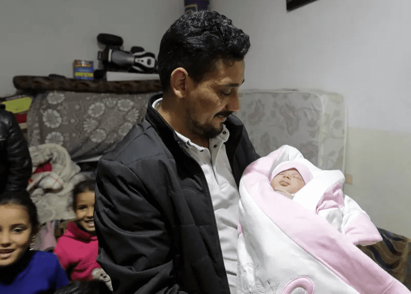 وكان يحمل على إحدى ذراعيه عفراء ملفوفة في غطاء وردي، بينما كان يضع في الأخرى طفلته المولودة حديثا عطاء في غطاء باللون الأزرق.