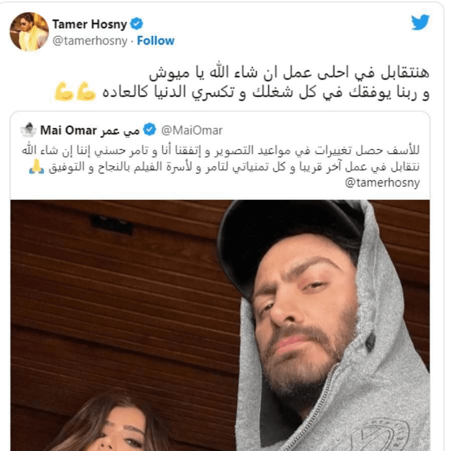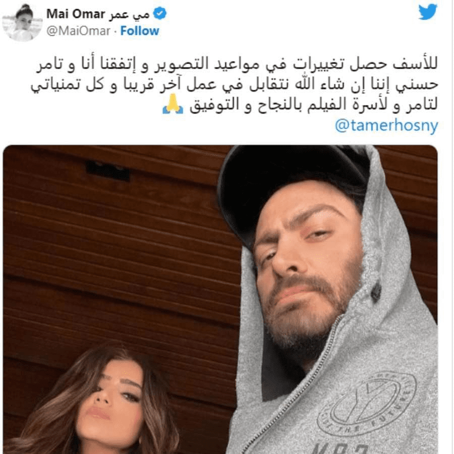 وكتبت عمر عبر حسابها في موقع تويتر: ”للأسف حصل تغييرات بمواعيد التصوير وإتفقنا أنا وتامر حسني إننا نتقابل في عمل آخر قريبًا وكل تمنياتي لتامر ولأسرة الفيلم بالنجاح والتوفيق“. ** تامر حسني يرد على مي عمر