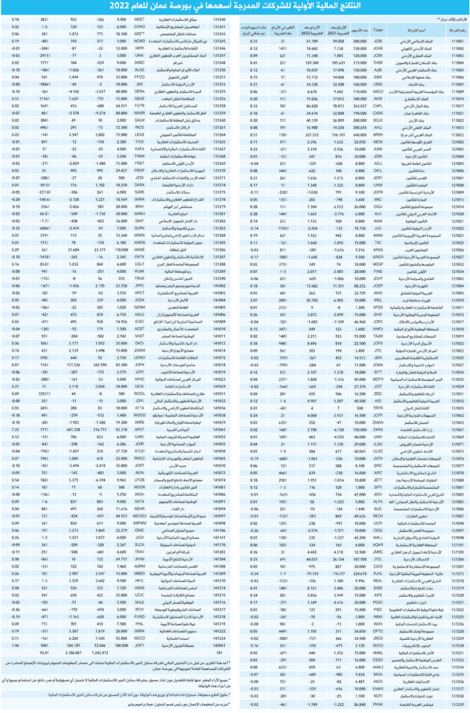 يذكر أن أرباح 181 شركة مدرجة أسهمها في بورصة عمان بلغت 2.38 مليار دينار للسنة المالية 2022، مقارنة 1.24 مليار دينار للعام 2021، لتسجل بذلك ارتفاعا نسبته 92 % وهي الاعلى في تاريخ البورصة، وفقا لدراسة تجميعة قامت بها شركة سنابل الخير التابعة للبنك الاسلامي الاردني.