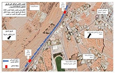 وقالت الوزارة في بيان صحفي صادر عن وحدة الإعلام والاتصال، اليوم السبت، إنه سيتم إغلاق السير بشكل جزئي على الجسر بعد ان تم إنهاء الأعمال المطلوبة على جسر الأول من طريق السلط الدائري بالإتجاهين.