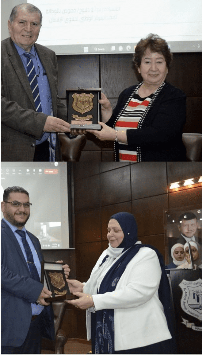 الدكتور مؤمن الحديدي عضو مجلس امناء المجلس الوطني لشؤون الاسرة والاستاذة ريم ابو دلبوح مفوض بالوكالة لمدير المركز الوطني لحقوق الإنسان والدكتور محمد مقدادي امين علم المجلس الوطني لشؤون الاسرة والدكتورة شريفة نعمان العمادي المديرة التنفيذية لمعهد الدوحة الدولي لشؤون الاسرة والدكتور تيسير الشواش مستشار علم نفس الاكلينيكي والدكتور اشرف الصالحي من القطاع الخاص والدكتورة رندة محاسنة من الجامعة الهاشمية والدكتور خالد الحديدي مدير المركز الوطني للصحة النفسية والرائد رحمة جبريل من المركز الوطني للعناية بصحة المرأة والدكتورة نافرة سهاونة من مركز صحي عين الباشا .. وتم تقديم توصيات في مجال ومحاور الملتقى للجهات المعنية ولتعزيز صحة المراة.