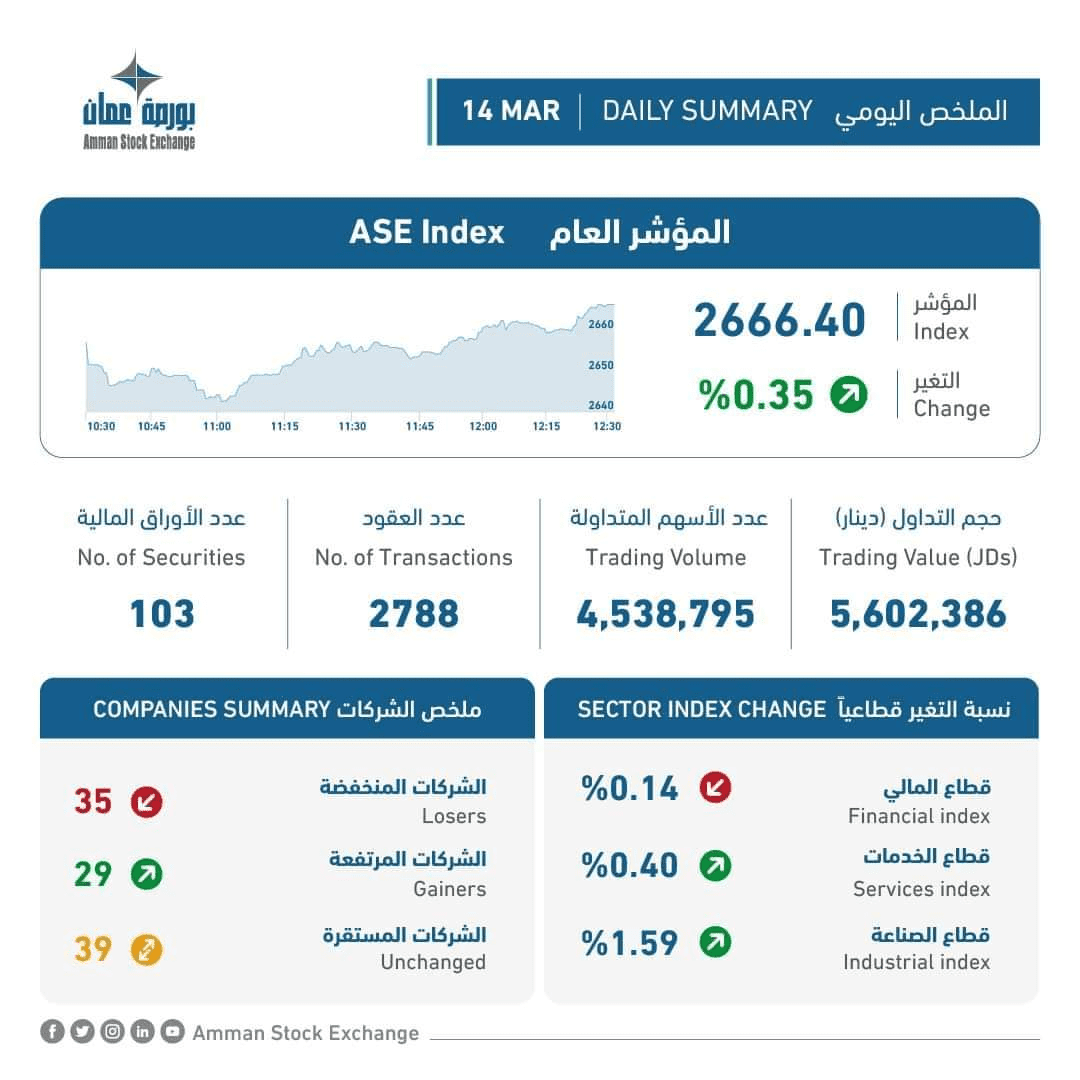 نبأ الأردن - بلغ حجم التداول الإجمالي ليوم الثلاثاء 14/03/2023 حوالي (5.6) مليون دينار وعدد الأسهم المتداولة (4.5) مليون سهم، نفذت من خلال (2,786) عقداً.