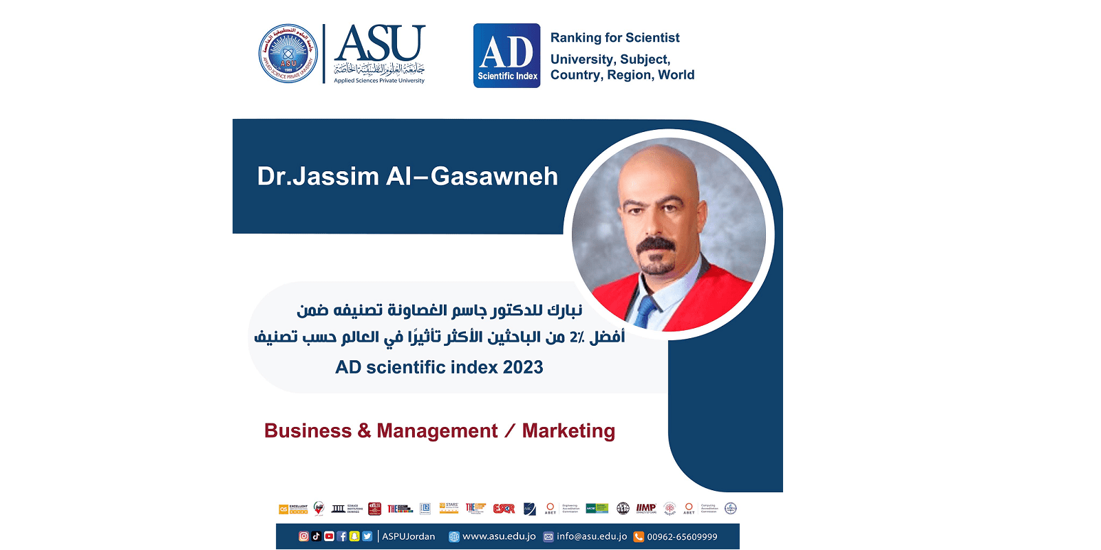 نبأ الاردن-صنف الدكتور جاسم الغصاونة رئيس قسم التسويق في كلية الأعمال ضمن أفضل 2% من الباحثين الأكثر تأثيرًا في العالم بحسب تصنيف AD scientific index 2023 العالمي.