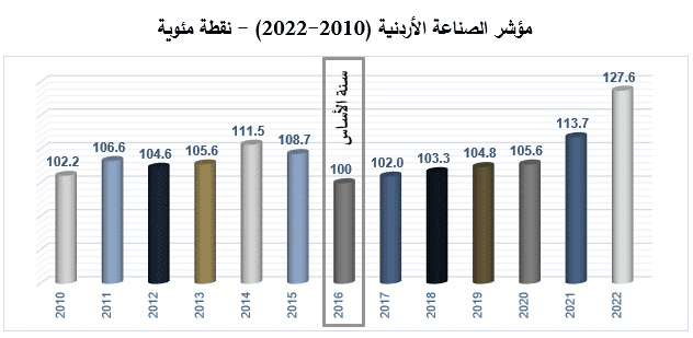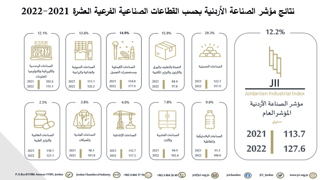 وأكد الجغبير على أن المؤشر قد أظهر ملامساته الفعلية لعكس الصورة الواقعية لتطور القطاع الصناعي، ليس فقط على صعيد القطاع بشكل عام بل على مستوى قطاعاته الفرعية العشرة كلٌّ على حِدا، فقد حققت كافة القطاعات الفرعية نمواً خلال العام 2022 وفقاً للمؤشر، جاء أبزرها قطاع الصناعات التعدينية كأعلى القطاعات الصناعية العشرة نمواً وبأكثر من 29.3% نتيجة إرتفاع الطلب العالمي على منتجات القطاع، يليه قطاع صناعات التعبئة والتغليف والورق والكرتون واللوازم المكتبية بمعدل نمو بلغ 15.9% والذي يعتبر أحد القطاعات ذات التشابكية العالية مع مختلف القطاعات والأنشطة الاقتصادية، فيما حقق قطاع الصناعات الكيماوية ومستحضرات التجميل نمو بلغت نسبته 14.9% نتيجة ارتفاع جل صادرات منتجات القطاع وخاصة منتجات الأسمدة والمنظفات ومواد الصابون وغيرها.