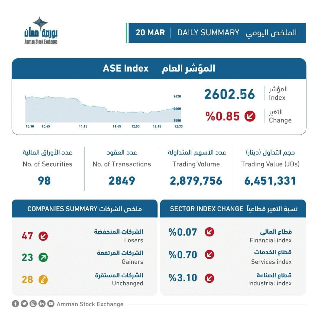 الملخص اليومي لبورصة عمان