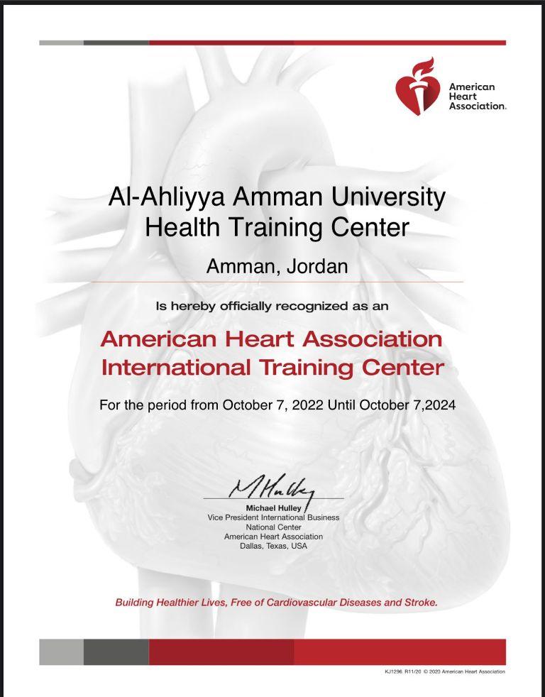 نبأ الأردن-حصل مركز جامعة عمان الاهلية للتدريب الصحي (Al-Ahliyya Amman University Health Training center) على موافقة وزارة التعليم العالي لعقد دورات متخصصة في التعليم الصحي، وهو المركز الأول في الأردن المعتمد لجمعية القلب الامريكية (American Heart Association) في جامعة اكاديمية اردنية.