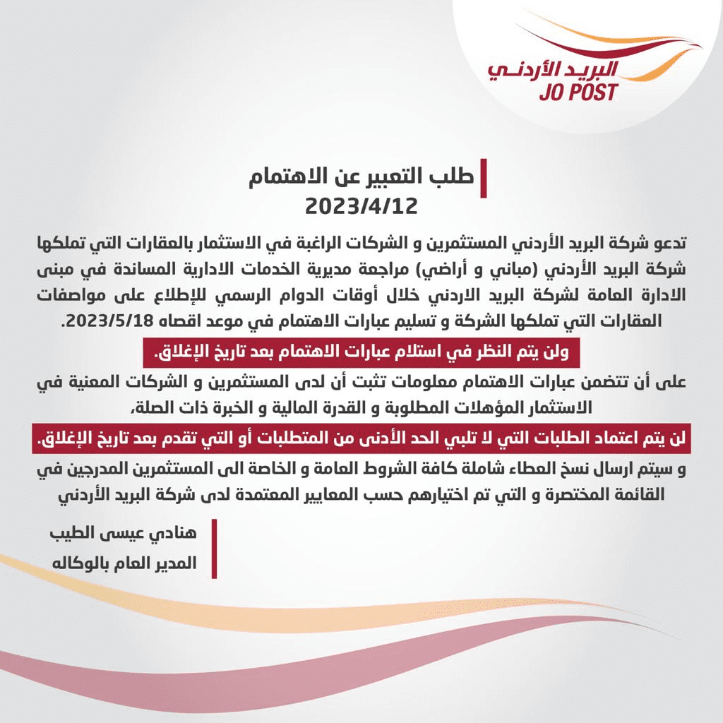 نبأ الأردن - دعت شركة البريد الأردني الراغبين في استثمار عقارات تمتكلها (مباني وأراضي) بتقديم طلب تعبير عن الاهتمام الى ادارة البريد خلال مدة لا تتجاوز يوم الثلاثاء 18/5/2023.