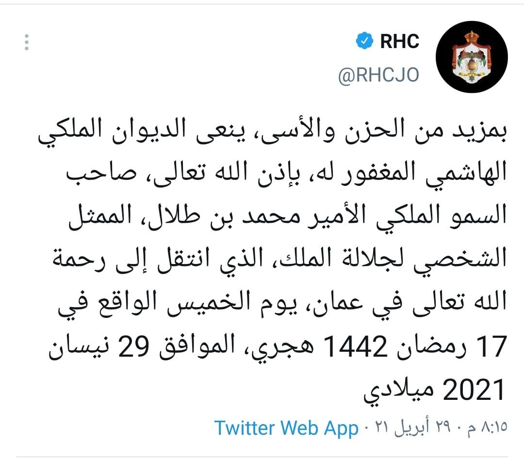 بمزيد من الحزن والأسى، ينعى الديوان الملكي الهاشمي المغفور له، بإذن الله تعالى، صاحب السمو الملكي الأمير محمد بن طلال، الممثل الشخصي لجلالة الملك، الذي انتقل إلى رحمة الله تعالى في عمان، يوم الخميس الواقع في 17 رمضان 1442 هجري، الموافق 29 نيسان 2021 ميلادي.