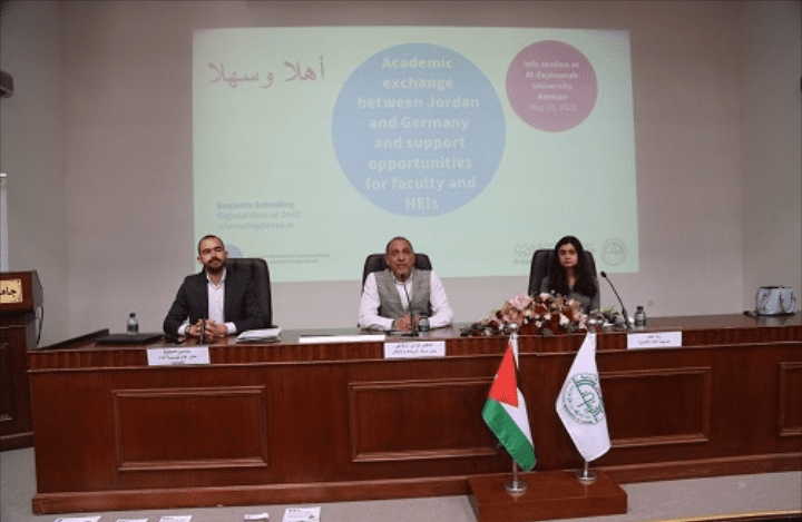 نبأ الأردن- نظم مركز الريادة والابتكار في جامعة الزيتونة الاردنية وبالتعاون مع مكتب ال DAAD الالماني للمنح الطلابية والتبادل الأكاديمي، محاضرة تعريفية حول اتاحة الفرص للمنح الطلابية والتبادل الأكاديمي للدراسة في الجامعات الألمانية، ألقاها مدير مكتب الوكالة الالمانية السيد بنيامين شميلينغ والسيدة زينا عبدو.