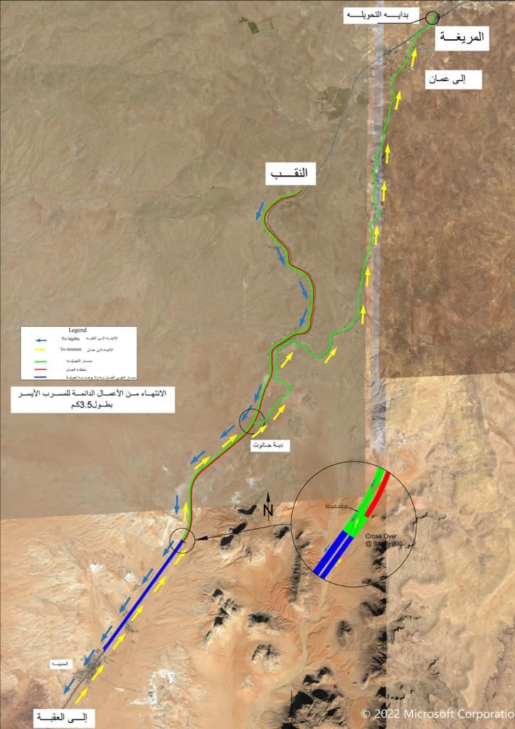 نبأ الأردن - اعلنت وزارة الأشغال العامة والإسكان عن انتهاء جزء من اعمال المسرب الايسر من مشروع الاجزاء الاكثر تضررا المتبقية من الطريق الصحراوي المتجه (نزول النقب) للمنطقة الواقعة من رأس النقب الى الحميمة بطول 3,5كم.