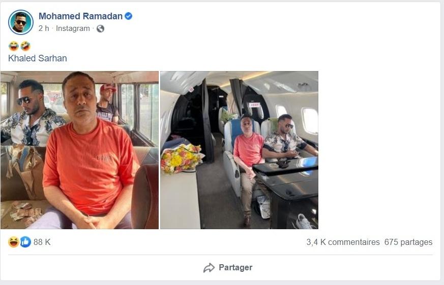 وقام خالد سرحان بمشاركة منشور محمد رمضان على صفحته الشخصية على الفايسبوك وعلق ساخرا: “أدفعلك ولا اشتريت الميكروباص؟”.