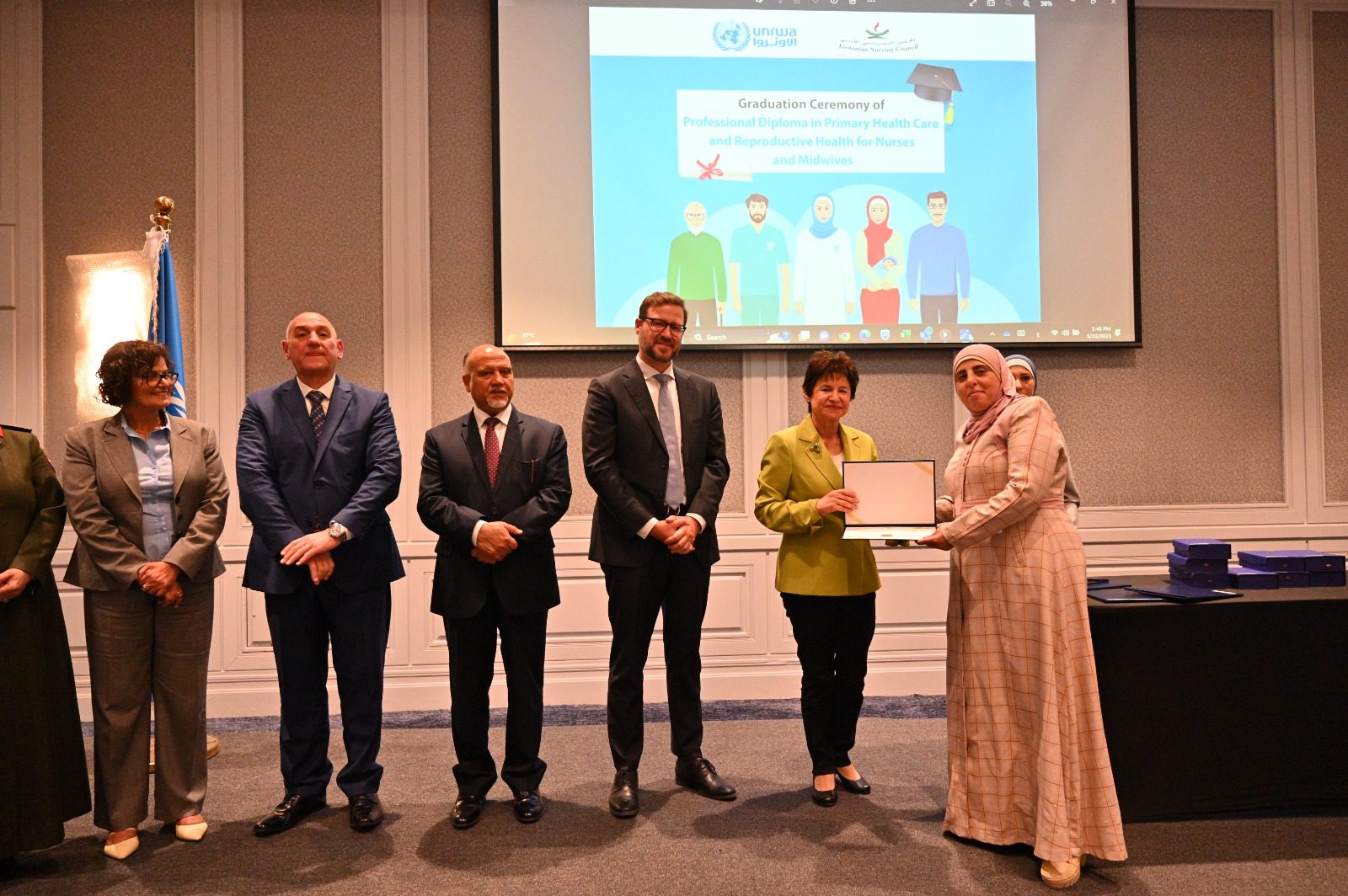 نبأ الأردن - مندوبة عن سمو الأميرة منى الحسين، رئيس المجلس التمريضي الأردني، خرجت رئيس مجلس أمناء جامعة اليرموك الدكتورة رويدا المعايطة، 35 متدرباً من برنامج الدبلوم المهني بالرعاية الصحية الأولية والإنجابية للمرضيين والممرضات والقابلات العاملين بالمراكز الصحية التابعة لوكالة الغوث (الأونروا) في الأردن والضفة الغربية وقطاع غزة، بالتعاون مع المجلس التمريضي الأردني.