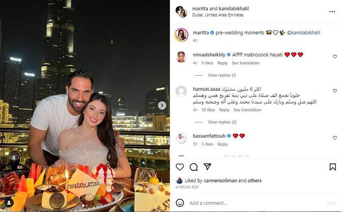 تواصل المطربة ماريتا الحلاني تحضيراتها واستعداداتها لحفل زفافها والمقرر إقامته خلال الساعات القليلة المقبلة.ونشرت "ماريتا" صور جديدة لها برفقة خطيبها كميل أبي خليل عبر حسابها الرسمي على "انستجرام" وظهرت خلالها وهي تحتفل مع خطيبها في دبي وعلقت قائلة "لحظات ما قبل الزفاف".